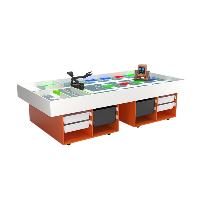 Данная модель стола отлично подойдёт для конструирования и испытаний. Стол оснащен игровой поверхностью и ящиками для хранения материалов и работ учащихся. А также в комплекте идет панель ПВХ с ярким дизайном для проведения демонстраций, которая точно привлечет внимание детей и вызовет интерес к работе. Стол подойдет для ежедневных занятий и для соревнований сконструированных роботов. Такой стол отлично подойдет для групповых занятий, так как имеет просторную поверхность и ученики смогут комфортно себя чувствовать во время занятия.