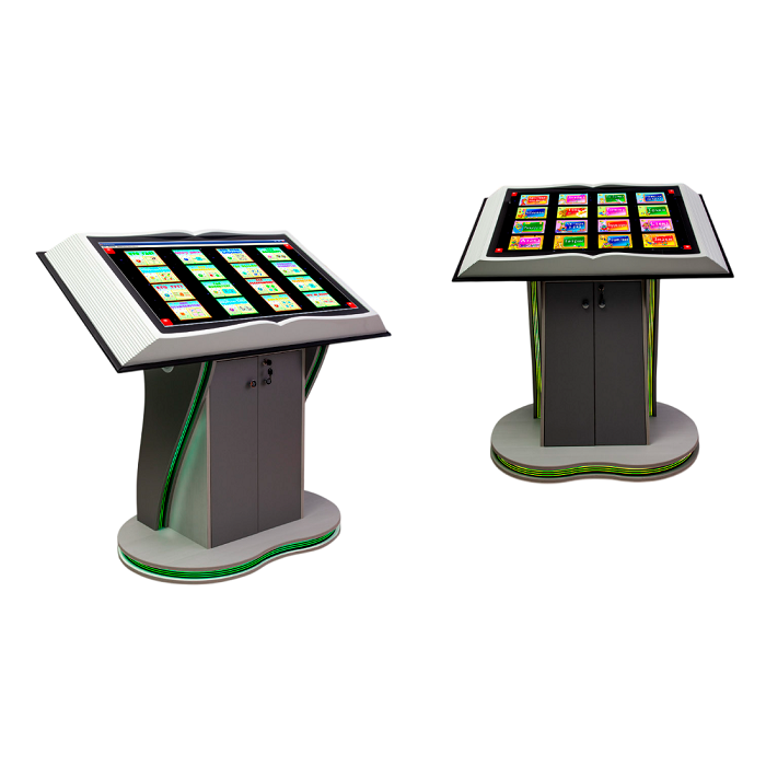 Интерактивная книга является единой мультимедийной сенсорной системой в стилизованном корпусе. Верхняя часть интерактивной книги представляет собой антивандальный сенсорный монитор, заключенный в декоративный корпус, выполненный в виде развернутой книги. Нижняя часть сенсорной книги представляет собой стойку со светодиодными декоративными вставками. Интерактивный монитор расположен под оптимальным углом для удобства пользователя.