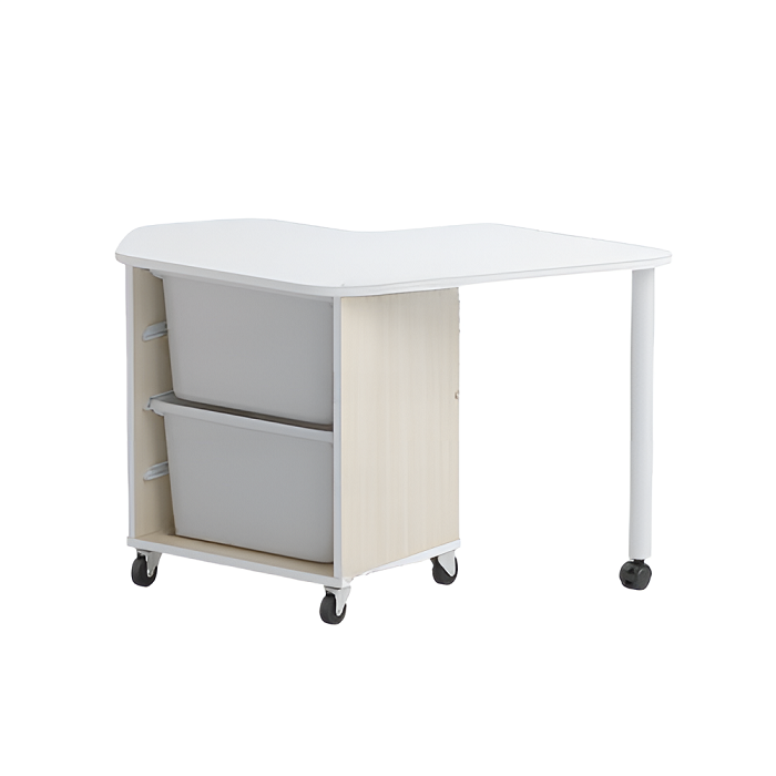 Стол детский правый Робик 002 выполнен из цветной ламинированной ДСП 16мм, кромки щитовых элементов облицованы кромочным пластиком толщиной 2 мм. Конструктивно стол выполнен в виде тумбы на колёсных опорах (две опоры с тормозом) и крышкой имеющей свес, поддерживаемый металлической опорой на колёсике. Внутри стола в открытой нише установлены два пластиковых лотка высотой по 230мм (длина лотка – 420 мм, ширина – 300 мм).
