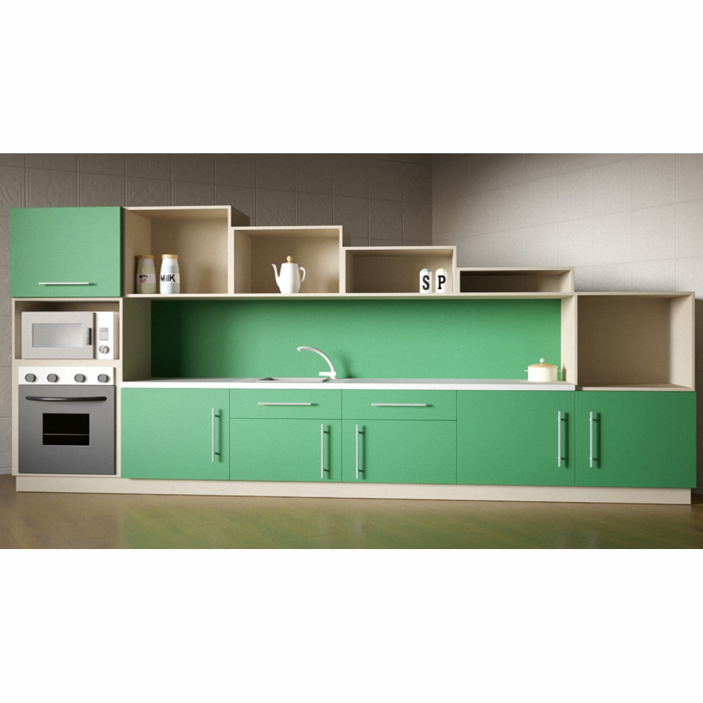 Верхний ярус кухни имеет красивую форму исполнения, которая, вне всяких сомнений, привлечет детское любопытство. Фасады окрашены в зелено-коричневоц сдержанной гамме, оттенены отдельными элементами белоснежного цвета. Вся детская кухня изготовлена из экологически чистых материалов высокого качества.