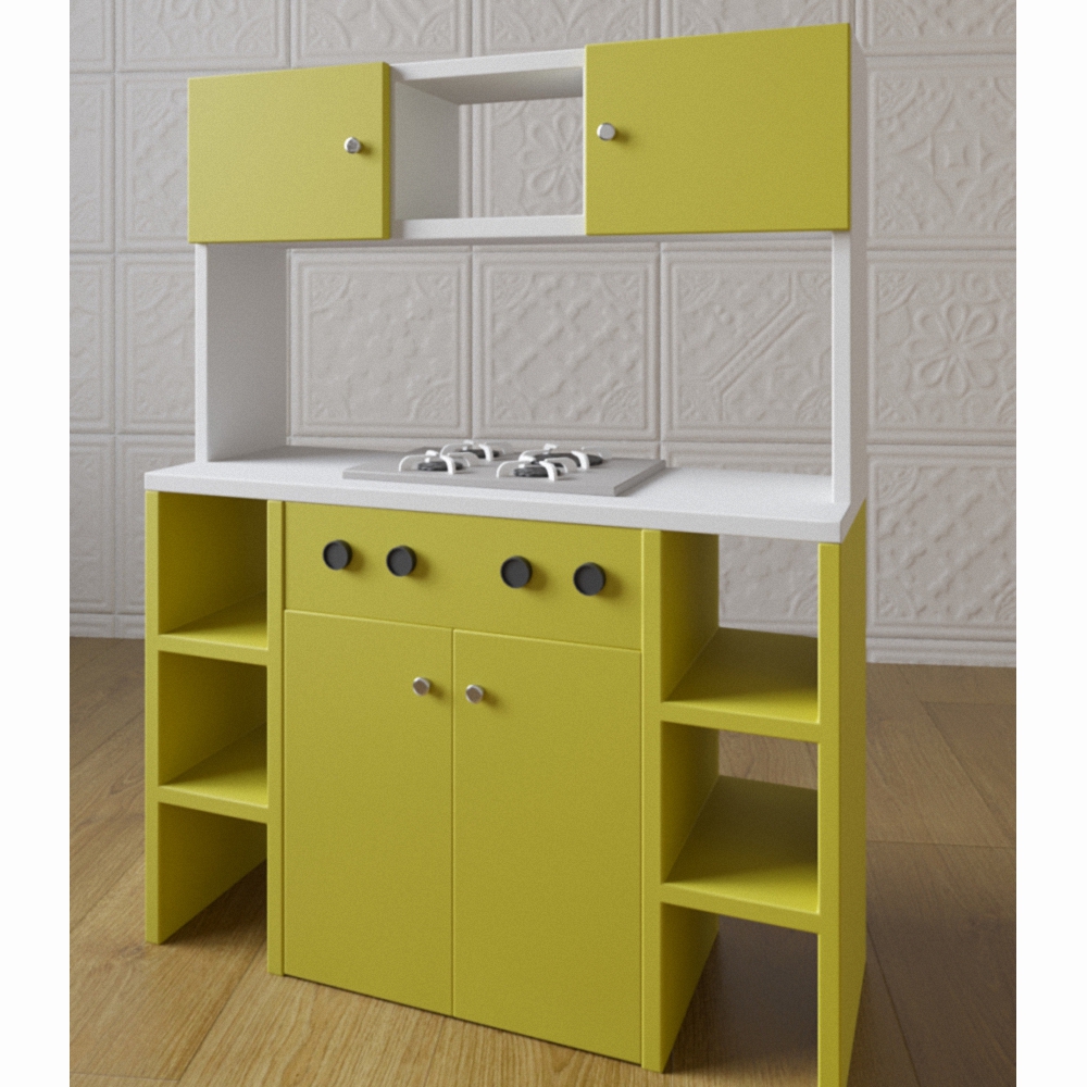 Фасад представленной кухни яркого и сочного салатового цвета, его отлично оттеняет белоснежная столешница и такого же цвета верхний ярус. Детская кухня «Алиса№1» имеет 2 рабочие зоны, благодаря чему за ней с удобством могут одновременно разместиться 2 девочки, абсолютно не стесняя друг друга. Изготовлена из высококачественных материалов, которые также безопасны в использовании.