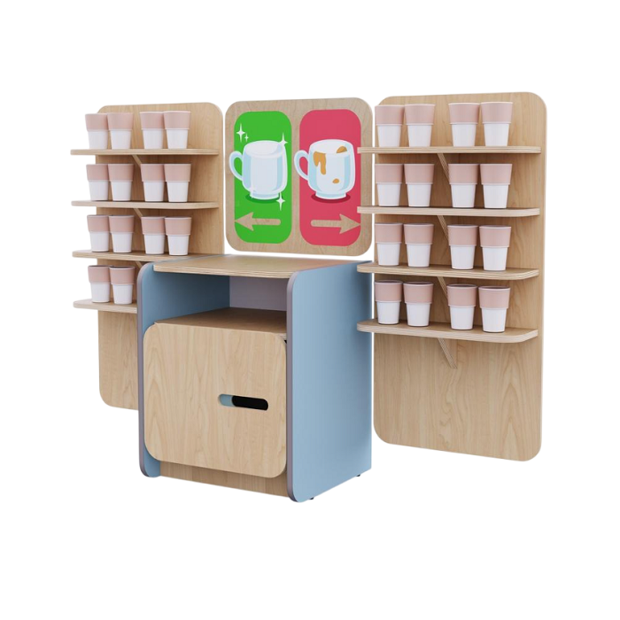 Набор для организации питьевого режима в детском саду: тумба для чайника, две навесные полки для кружек и табличка «Чистые и грязные кружки».