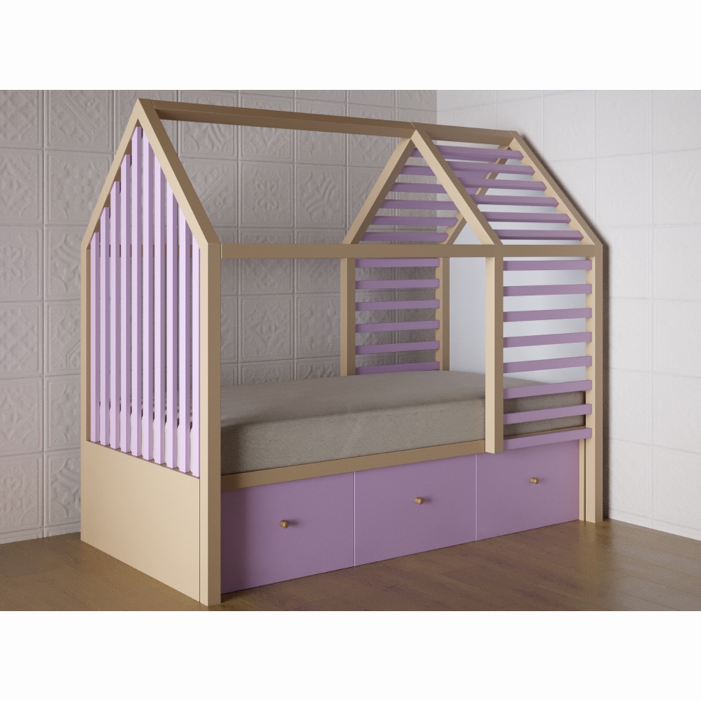 Конструкция кровати представляет из себя домик в скандинавском стиле с крышей и стенами, часть которых отделаны рейкой нежно-лилового цвета, визуально разграничивая пространство. Внизу есть 3 ящика для игрушек. Кровать «Инга» предназначена для детей от 3 до 10 лет. Выполнена в бело-лиловой цветовой гамме, и прекрасно подойдет для детской комнаты девочки. Дизайн наиболее простой и лаконичный, что позволяет украсить место для сна ребенка дополнительными аксессуарами – например, повесить балдахин или добавить ночник-гирлянду по всему периметру крыши кроватки.