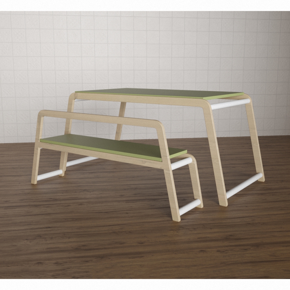 Детский стол “Моя первая парта” нужен для групп в ДОУ, подойдет также для занятий в начальных классах, коррекционных и развивающих центрах. Он имеет очень простую конструкцию - состоит из 4-х находящихся под оптимальным углом наклона ножек (соединенных перекладинами попарно для большей надежности) и столешницы формы прямоугольника. Весь модуль имеет цвет натуральной древесины, кроме столешницы – она окрашена в спокойный зеленый цвет. За ним можно разместить 1-2 ребёнка. К столу такой конструкции можно подобрать подходящую по исполнению скамейку.