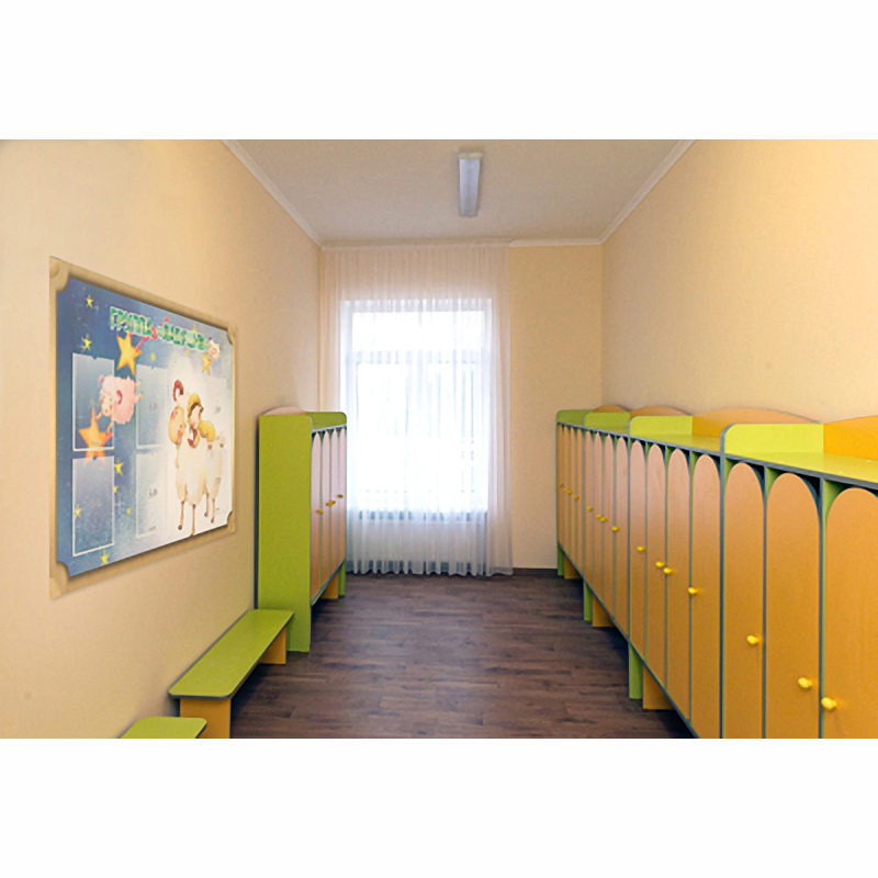 Группа для самых маленьких по достоинству оценит дизайн этого стенда. Малышей порадуют веселые барашки, которые мчатся по небу. Внимательные дети найдут желтые звездочки в вечернем небе.