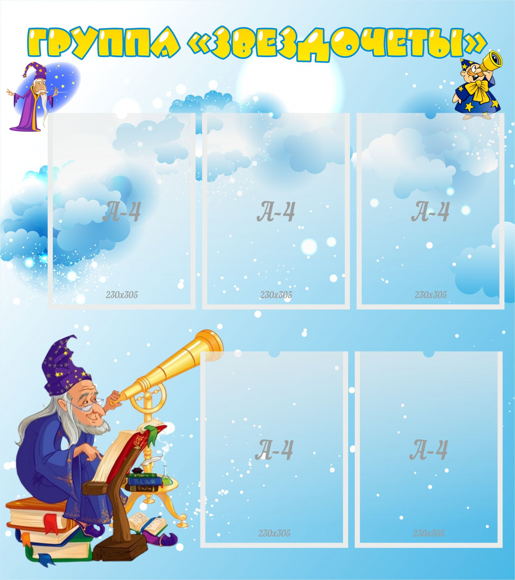 Мудрые Звездочёты знают всё и обо всём вокруг. И конечно, с радостью поделятся своими знаниями.  Стенд поможет разместить самую важную информацию о жизни детского сада, правила, нормы, объявления, контакты и другое. Обмен информацией между администрацией/воспитателями детского сада и родителями повышает доверие и формирует положительное впечатление в целом.