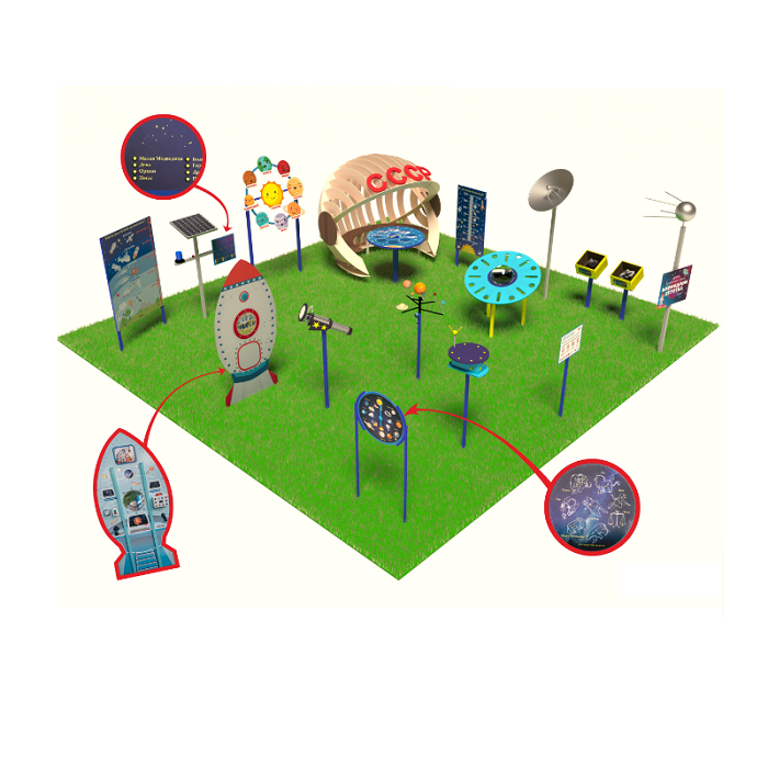 «Детская космическая станция» - это уличный комплекс, в состав которого входят красочные интерактивные стенды и макеты. С их помощью дети осваивают первые азы астрономии.