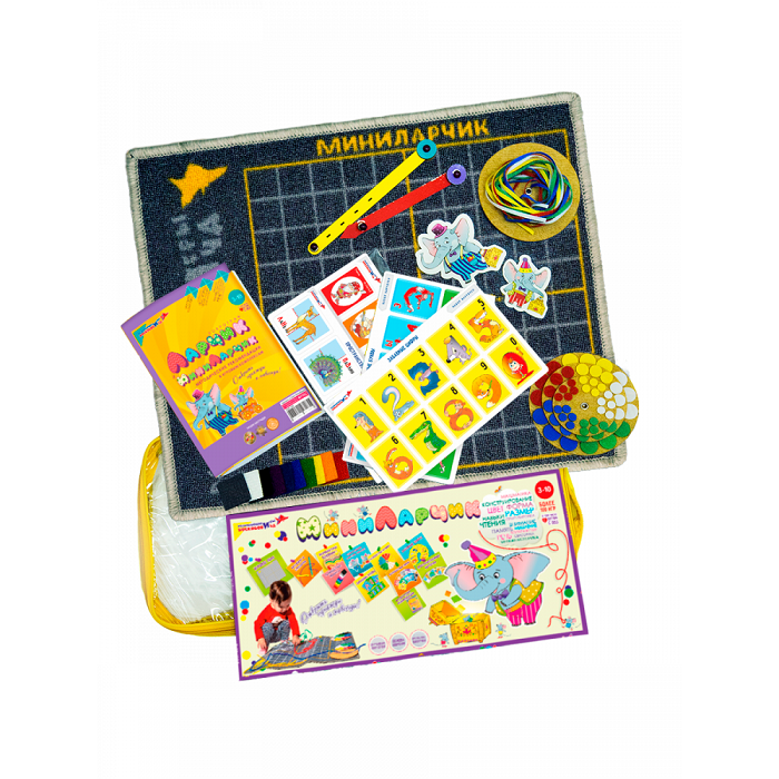 Игровой комплект «МиниЛарчик» представляет уменьшенную копию «Коврографа Ларчик» и является индивидуальным пособием для выполнения ребёнком задач разной сложности. Игровое поле может располагаться как на стене, так и на столе. Игровые элементы на  обратной стороне имеют крепление "липучка".