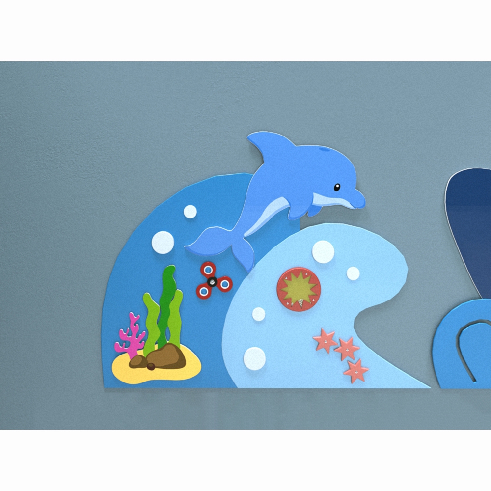 Бизиборд – дидактическое приспособление с игровым уклоном для детей от 3 лет. Может быть как объёмным (куб, домик), так и более компактным - в виде плоской настенной панели, которая замечательно экономит игровое пространство, не уменьшая при этом его ценности. Бизиборд «Дельфин» - одна из таких моделей. Она прекрасно подойдёт для оснащения детских уголков в различных заведениях (кафе, магазинах, банках), размещения в группах детских садиков, подойдёт и для использования дома.