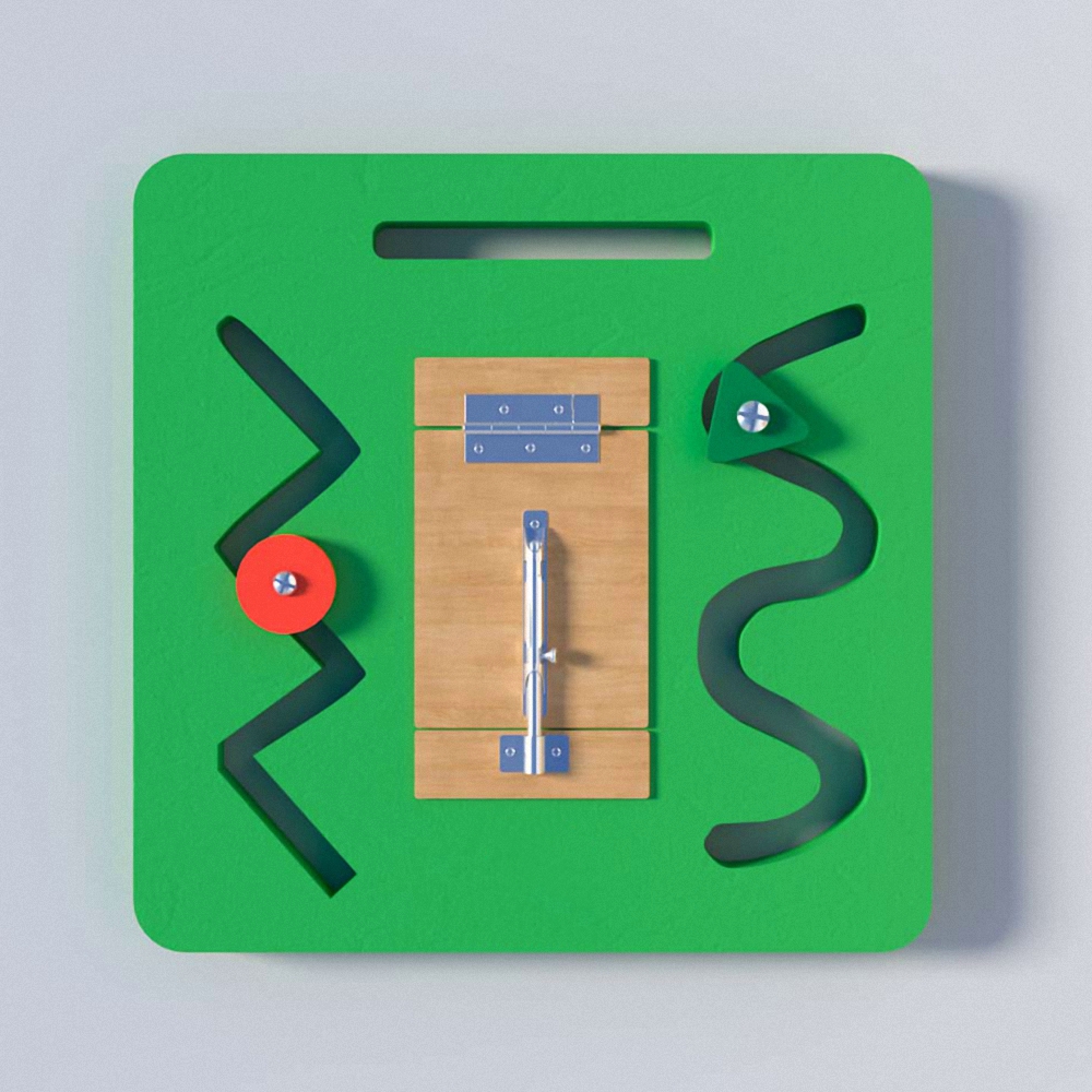 • Замочек подвижный, отличается на ощупь от других предметов, малышу необходимо захватить ручку на щеколде, и усилием сдвинуть, а затем выполнить те же движение в другую сторону.