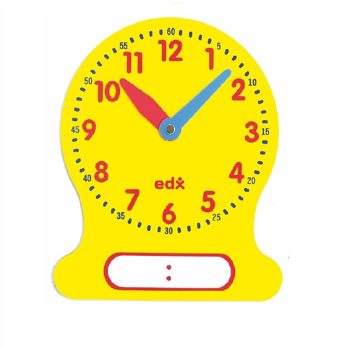 Время представлено на часах как в аналоговом виде (стрелки), так и в цифровом - ниже стрелочного циферблата специальное место для написания цифр стирающимся маркером.